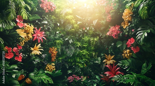 A vibrant indoor tropical living wall filled with lush green foliage and colorful exotic flowers, bright sunlight streaming through, giving the space a warm, natural ambiance, hyper-realistic details,