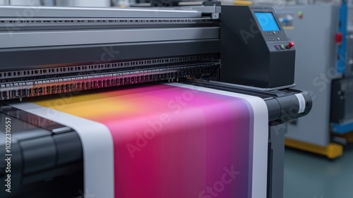 A vibrant inkjet printer producing a vivid gradient print, showcasing color technology in a modern printing environment.