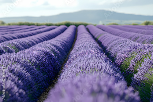 A vibrant lavender field stretching endlessly to the horizon, bathed in soft sunlight. The scene embodies tranquility, natural beauty, and perfect harmony with the environment