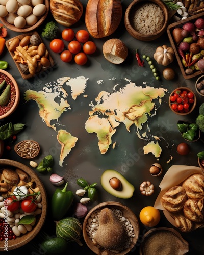 A vibrant layout of global ingredients showcasing diverse foods around a world map, highlighting culinary richness and variety.