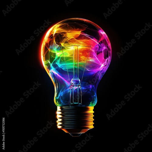 A vibrant light bulb filled with swirling rainbow colors, symbolizing creativity and inspiration against a dark backdrop.
