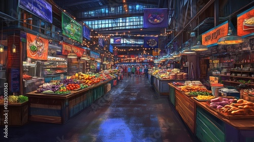 A vibrant market scene featuring colorful stalls filled with fresh produce and food items.