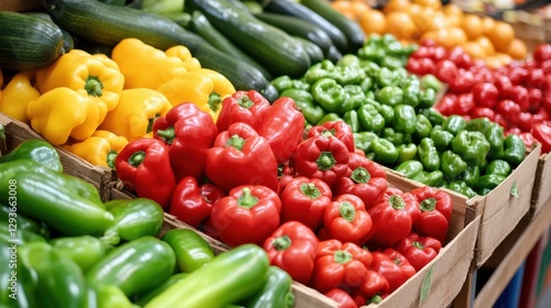 A vibrant market scene showcasing an assortment of vegetables neatly arranged in boxes, highlighting their colors and textures.