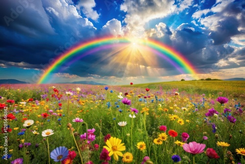 A vibrant meadow blossoms under a radiant rainbow arch, sunbeams illuminating a breathtaking display of wildflowers after a summer shower