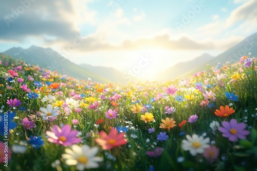 A vibrant meadow filled with colorful flowers under a bright sky, framed by mountains, captures the beauty of nature at sunrise.