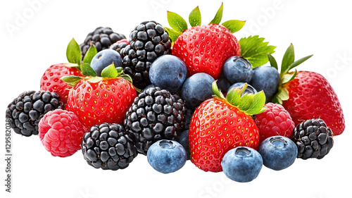 A vibrant mix of strawberries, blueberries, raspberries, and blackberries, all fresh and juicy, isolated on a transparent background.