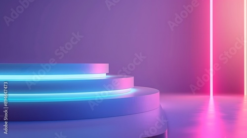 A vibrant, modern stage with glowing neon lights in purple and blue, perfect for presentations or photoshoots.