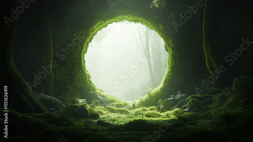 A vibrant, moss-covered opening in a mystical forest leads to a serene, illuminated path