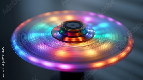 A vibrant multi colored LED fidget spinner is captured in motion creating a mesmerizing blur of light