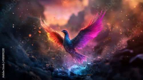 A vibrant, mythical bird spreads its colorful wings against a mystical background, embodying themes of rebirth and transformation.