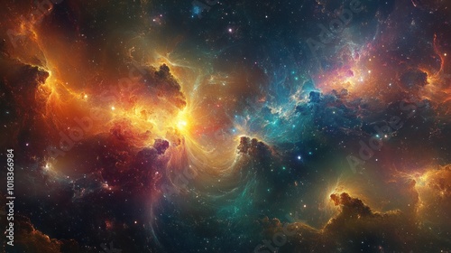A vibrant nebula, a swirling cloud of gas and dust in space, glows with brilliant colors of red, orange, blue, and green, creating a breathtaking cosmic landscape.