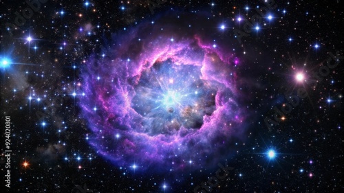A vibrant nebula with a bright, white core surrounded by swirling purple and blue gas, with a backdrop of twinkling stars representing the vastness of space.