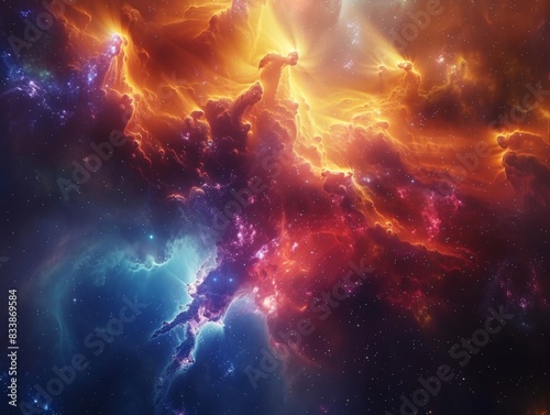 A vibrant nebula with glowing orange and blue clouds. Bright cosmic rays emanate from the center, creating a dramatic contrast against the dark , showcasing the beauty of the universe.