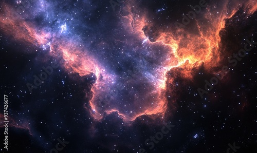 A vibrant nebula with swirling clouds of red and blue gas, scattered with bright stars.