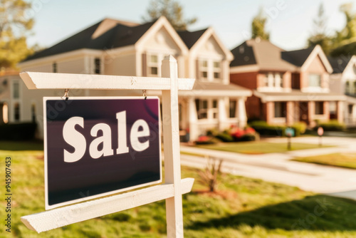 A vibrant neighborhood scene featuring a 'Sale' sign in front of beautiful homes, ideal for real estate marketing.