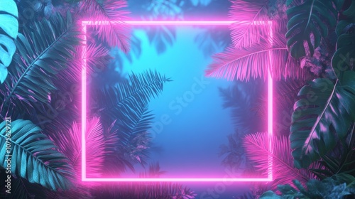 A vibrant neon frame surrounded by lush tropical leaves, creating a surreal and captivating atmosphere.