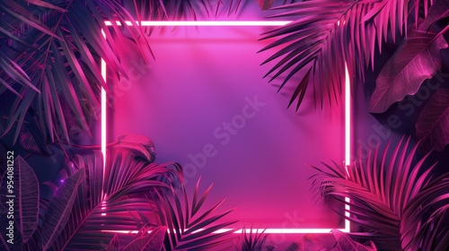 A vibrant neon frame surrounded by lush tropical leaves, perfect for showcasing text or graphics.