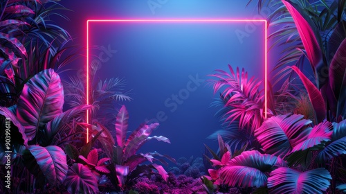 A vibrant neon frame surrounds a tropical paradise, with lush plants and neon accents creating a surreal and exotic atmosphere.