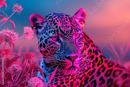 A vibrant, neon-colored leopard stares intensely from behind a backdrop of tropical foliage. Beautiful simple AI generated image in 4K, unique.