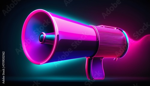 A vibrant, neon-lit megaphone with a sleek design, radiating sound waves.
