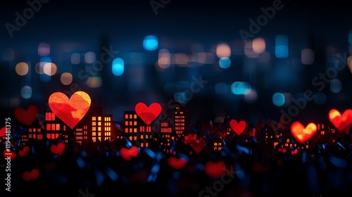 A vibrant night cityscape adorned with glowing heart shapes, symbolizing love and connection amidst urban life.