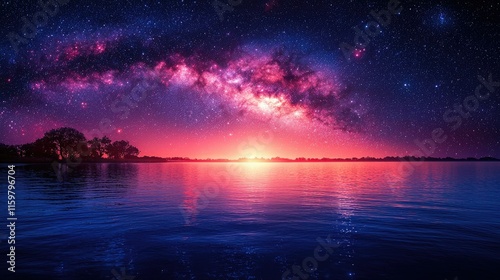 A vibrant night sky over a calm lake, showcasing the Milky Way and colorful reflections.