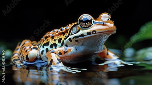 A vibrant orange and black spotted frog resting on the water's edge in a lush green environment during the daytime, showcasing its stunning colors and reflective eyes