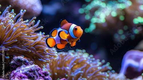 A vibrant orange and white clownfish swims near a colorful anemone in a tropical reef.