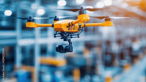 A vibrant orange drone equipped with a camera hovers in an industrial setting, showcasing advanced technology and innovation in aerial surveillance.