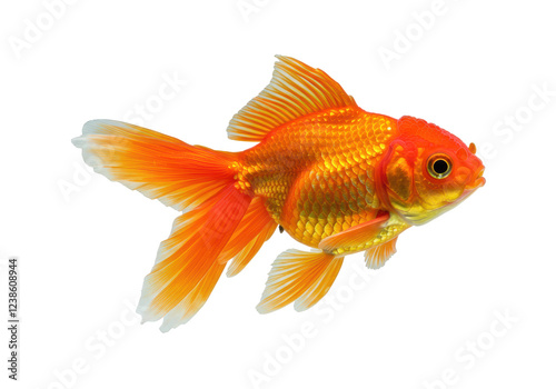A vibrant orange goldfish with long, flowing fins, isolated on a white background
