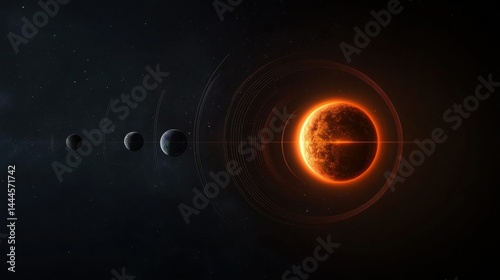 A vibrant orange planet and smaller celestial bodies in space