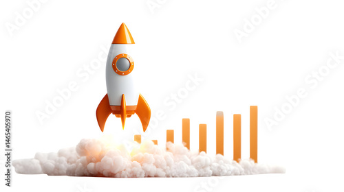 A vibrant orange rocket launching through white clouds towards ascending orange bars symbolizing growth and success in business and technology.