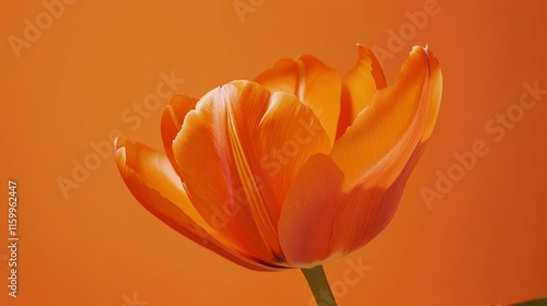 A vibrant orange tulip with bold, pointed petals, against a bright orange background