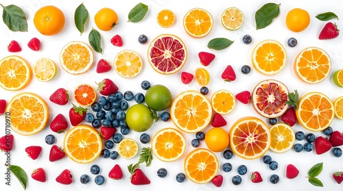 A vibrant overhead flat lay of assorted fresh citrus fruits and berries artfully arranged on a clean white surface for a healthy eating concept