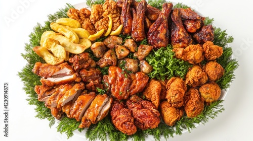 A vibrant overhead view of a platter filled with assorted fried chicken pieces, including wings, thighs, and drumsticks, elegantly arranged on a white background for an appetizing presentation.