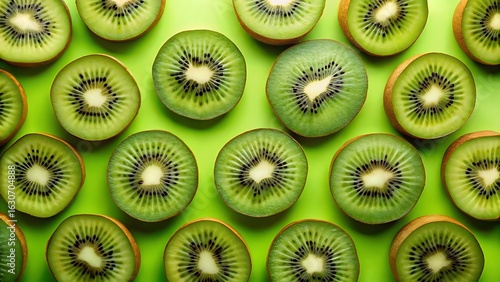 A vibrant overhead view of many sliced kiwis arranged in a pattern on a bright green background, showcasing their fresh, healthy texture and seeds
