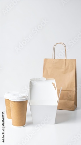 A vibrant paper cup with a colorful design sits beside two neatly stacked takeaway boxes, showcasing a delicious meal, perfect for on-the-go dining.