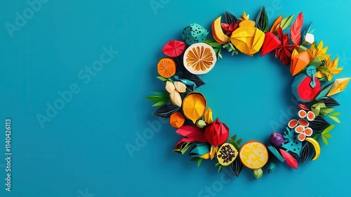 A vibrant papercut zodiac wheel adorned with origamiinspired food elements