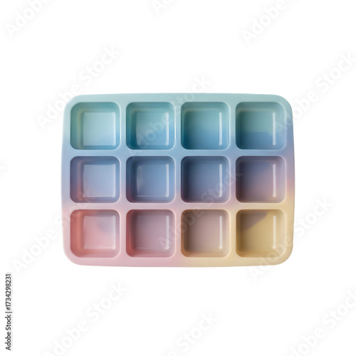 A vibrant pastel rainbow silicone ice cube tray with twelve square compartments.