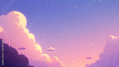 A vibrant, pastel sky with fluffy white clouds at sunset with twinkling stars.
