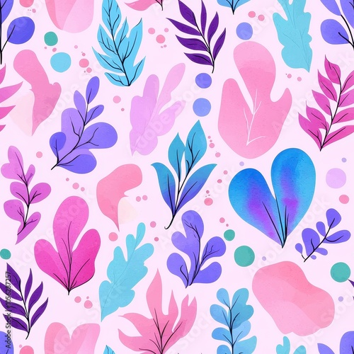 A vibrant pattern featuring colorful leaves and abstract shapes in shades of pink, blue, and purple on a light pink background.