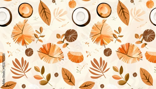 A vibrant pattern featuring leaves, fruits, and botanical elements in warm orange and brown tones.