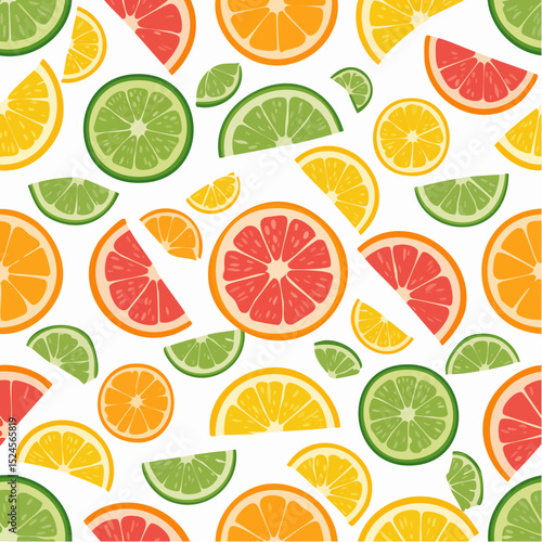 A vibrant pattern featuring slices of orange, lemon, kiwi, and watermelon in bold, juicy colors, presented in a flat vector style.