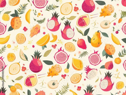 A vibrant pattern featuring various fruits and leaves for decorative use.