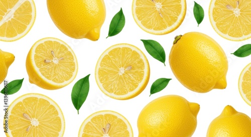 A vibrant pattern of whole and sliced lemons with green leaves scattered on a white background surface