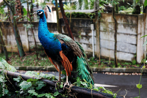 A vibrant peacock perches amidst lush greenery, with a concrete wall and road in the background, hinting at a structured yet natural environment.