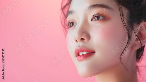 A vibrant photo of an Asian model promoting skincare products, with flawless, glowing skin and a bright, minimalist background that highlights the freshness and purity of the brand. 8k UHD,