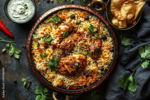 A vibrant photograph of a traditional Indian biryani served in a copper pot, with fragrant basmati rice, tender pieces of chicken