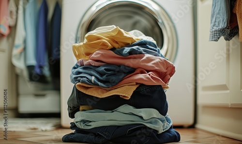 A vibrant pile of freshly laundered clothes in a cozy laundry room setting.