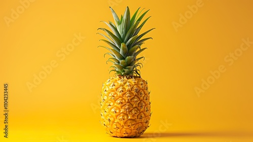 A vibrant pineapple stands tall against a bright yellow background, its golden skin and spiky green crown shining in the spotlight.